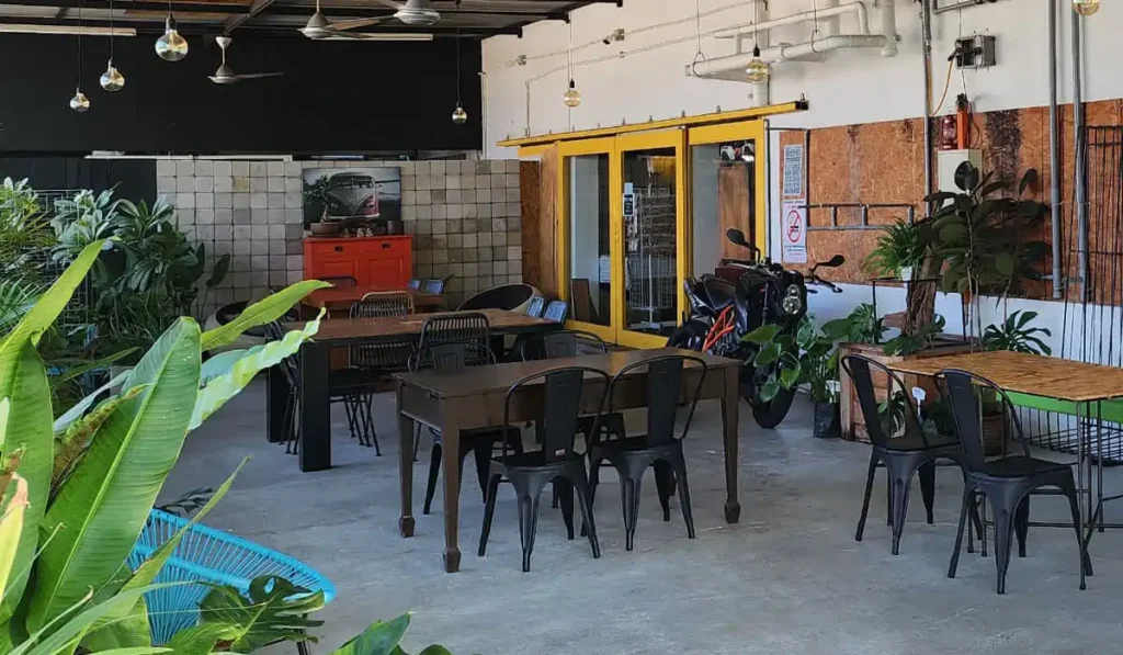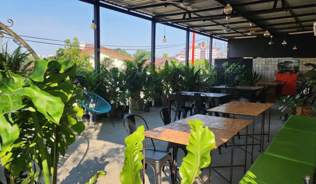 The project involved constructing a single-storey corner café with indoor and outdoor seating. Structural works included reinforced concrete flooring and steel roofing. The layout supports commercial kitchen operations, rustic interiors, and landscaped areas featuring timber finishes and potted greenery.